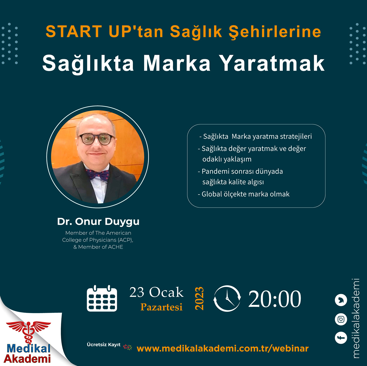 Medikal Akademi Online Eğitim Serisinin yeni oturumunda “START UP’tan Sağlık Şehirlerine; Sağlıkta Marka Yaratmak” konusundaki güncel gelişmeleri Dr. Onur Duygu değerlendirecek. Yayınımızın sonunda izleyici sorularına yer verilecektir. Sorularınızı yorum bölümümüze yazabilirsiniz. Kayıt butonu ile kayıt yaptırabilir ve yayın öncesinde hatırlatma maili alabilirsiniz. Youtube kanalımıza abone olarak sonraki webinar ve canlı yayınlarımızdan haberdar olabilirsiniz.