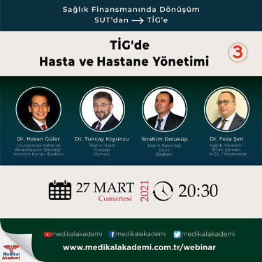 Medikal Akademi Sağlık Politikaları Söyleşimizin 3’üncü oturumunda “TİG’de Hasta ve Hastane Yönetimi” konusunu, Uluslararası Kalite ve Akreditasyon Derneği Yönetim Kurulu Başkanı Dr. Hasan Güler, Sağlık Bakanlığı Daire Başkanı İbrahim Doluküp ve Teşhis İlişkili Gruplar Uzmanı Dt. Tuncay Koyuncu ile Dr. Feza Şen moderatörlüğünde konuştuk. Youtube kanalımıza abone olarak sonraki etkinliklerden haberdar olabilirsiniz.