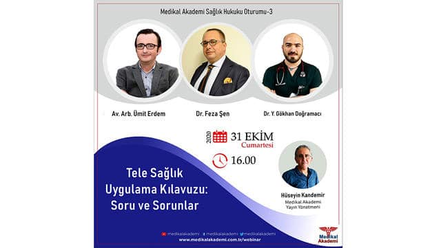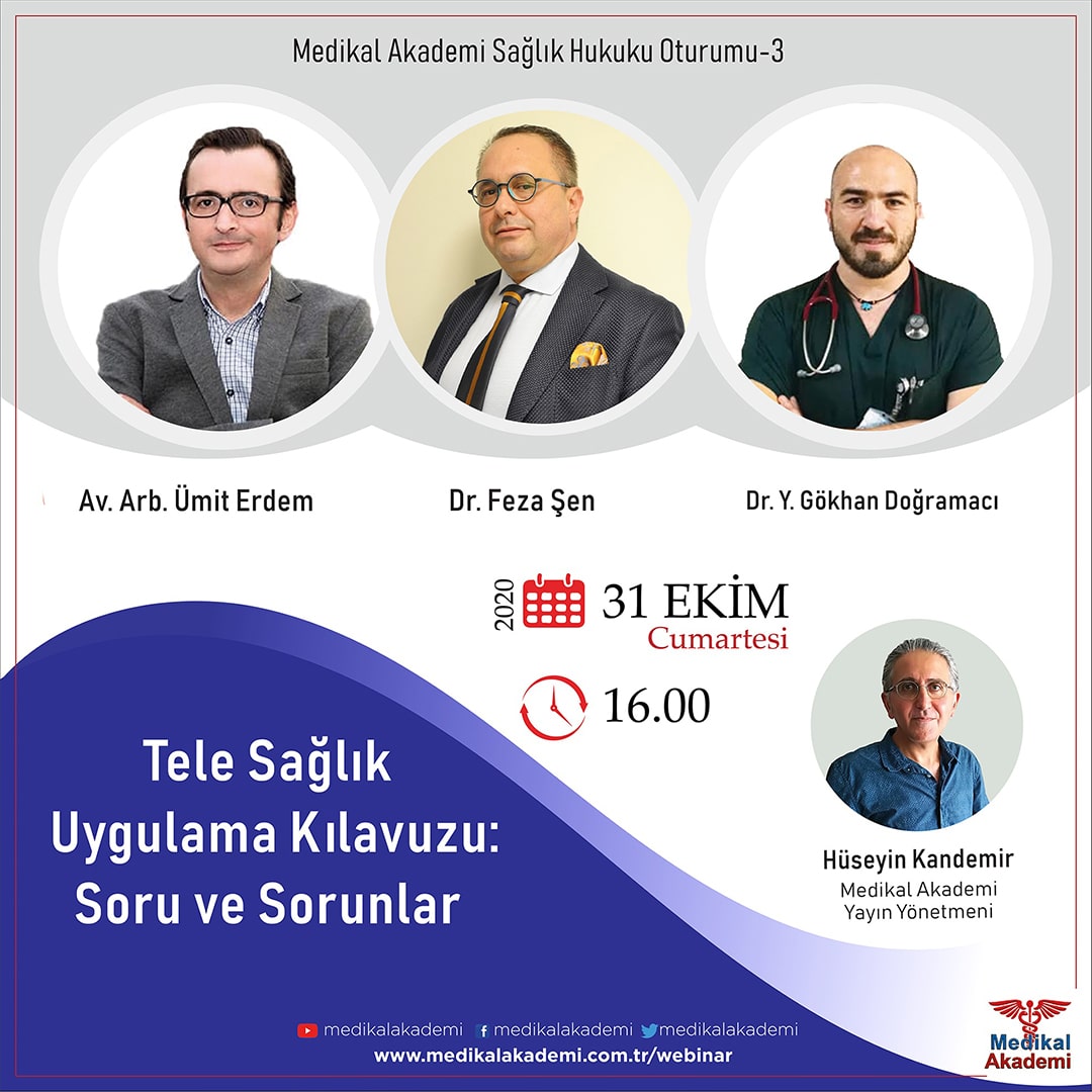 Medikal Akademi Sağlık Hukuku Oturumlarının yeni buluşmasında ‘Tele Sağlık Uygulama Kılavuzu’nu ve Tele-Tıp uygulamalarının pek çok boyutunu konuştuk. Etkinliğimize üç değerli konuğumuz; Sağlık Hukuku Uzmanı Av. Arb. Ümit Erdem, Hukukçu & Hekim ve Sağlık Hukuku Uzmanı Dr. Yakup Gökhan Doğramacı ve Tıp Hekimi Dr. Feza Şen katıldı.