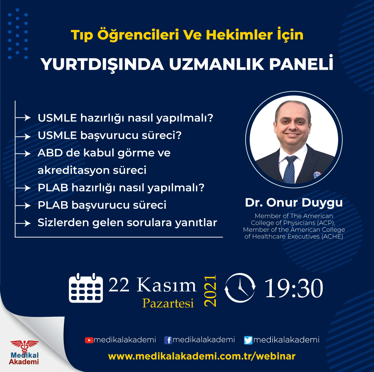 “Tıp Öğrencileri ve Hekimler için Yurtdışında Uzmanlık Paneli” konusunu tüm detayları ile Dr. Onur Duygu‘dan dinleyeceğiz. Tıp öğrencileri ve Hekimlere yönelik olan bu etkinliğimiz ücretsizdir ve tüm sağlık profesyonellerinin katılımına açıktır. Yayınımızın sonunda izleyici sorularına da yer verilecektir. Sorularınızı şimdiden yorum bölümümüze yazabilirsiniz. Kayıt butonuna tıklayarak etkinliğe kayıt yaptırabilir ve yayın öncesinde hatırlatma maili alabilirsiniz. Youtube kanalımıza abone olarak sonraki etkinlik ve yayınlarımızdan haberdar olabilirsiniz.