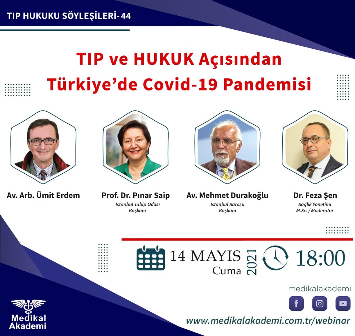 Medikal Akademi Tıp Hukuku Söyleşimizin 44’üncü oturumunda “Tıp ve Hukuk Açısından Türkiye’de Covid-19 Pandemisi” konusunu, İstanbul Tabip Odası Başkanı Prof. Dr. Pınar Saip, İstanbul Barosu Başkanı Av. Mehmet Durakoğlu ve Sağlık Hukuku Yazarı Av. Arb. Ümit Erdem ile Dr. Feza Şen moderatörlüğünde konuştuk. Youtube kanalımıza abone olarak sonraki etkinliklerden haberdar olabilirsiniz.