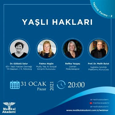Medikal Akademi ‘Yaşlılık Forumu’nda yaşlanma sürecini tüm boyutlarını uzman konuklarla tartışmaya devam ediyoruz. Bu haftaki oturumda ‘Yaşlı Hakları’ konusunu Sağlıkta İşbirliği Platformu Kurucusu Prof. Dr. Melih Bulut, Uzman Psikoterapist Refika Yazgaç ve Mutlu Yaş Al Sosyal Girişimi Kurucusu Fatma Akgün, 65+ Yaşlı Hakları Derneği YK Başkanı / Kognitif Nörolog Dr. Gülüstü Salur ile ele aldılar. Youtube kanalımıza abone olarak sonraki yayınlarımızdan haberdar olabilirsiniz.