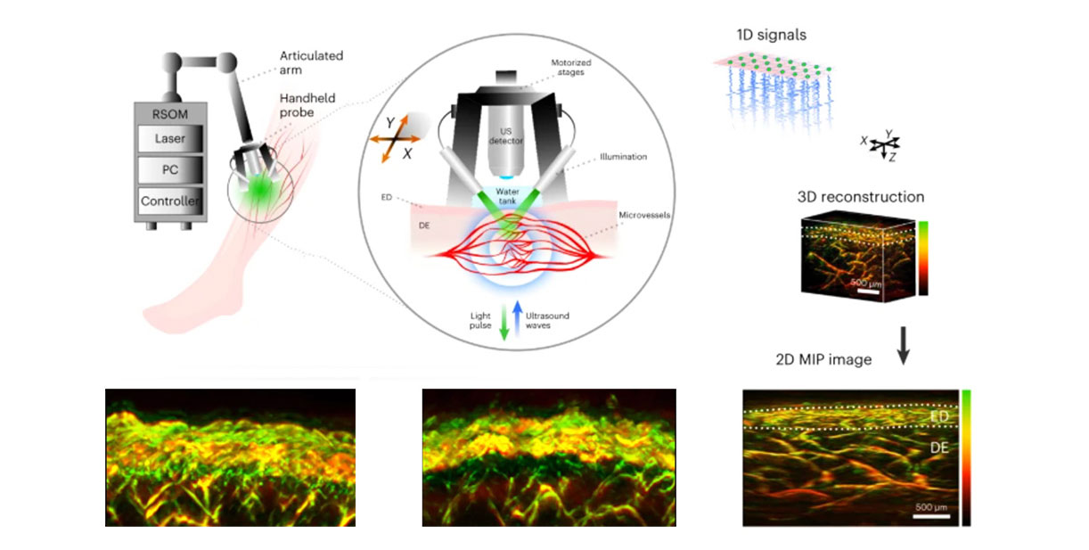 Optoakustik görüntüleme, ışık darbelerinin doku içinde ultrason dalgaları oluşturduğu son teknoloji bir tekniktir. Hemoglobin gibi ışığı emen moleküllerin etrafındaki dokunun genişleyip büzülmesiyle oluşturulan bu dalgalar, daha sonra kan damarlarının ayrıntılı görüntülerine dönüştürülüyor. Profesör Vasilis Ntziachristos ve Münih Teknik Üniversitesi’ndeki ekibi tarafından yürütülen çalışma, RSOM’un diğer invaziv olan yöntemlerden farklı olarak benzersiz derinlik ve ayrıntıya ulaştığını gösterdiler.