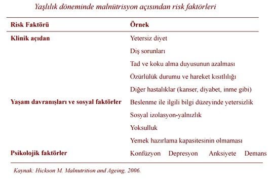 Çoğunlukla “protein-enerji malnütrisyonu” olarak ortaya çıkan yetersiz beslenme sorunları Dünyada sosyo-ekonomik açıdan az gelişmiş bölgelerde ve çoğunlukla da kırsal kesimlerde görülmektedir. Yaşlılık döneminde bireyler daha genç yaşlara göre protein-enerji malnütrisyonu açısından daha savunmasız, duyarlı ve örselenebilir özelliktedirler. Yanlış gıdaların tüketilmesi yaşlıların kronik hastalıklara yakalanma risklerini artırmaktadır. Altmış beş yaş üzeri grupta malnütrisyon sıklığı çeşitli çalışmalarda farklılık göstermektedir. Herhangi bir nedene bağlı malnütrisyon sıklığı yataklı bir tedavi kurumundaki geriatrik hastalar arasında %1-83; kendi evlerinde yaşayan “sağlam” yaşlılar arasında ise %2-32 arasında değişmektedir.