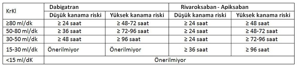 YOAK’ların düşük kanama riski olan cerrahi işlemlerde 24 saat önce ve yüksek kanama riski olanlarda ise 48-96 saat önce kesilmesi önerilmektedir. Kesilme süreleri ilaçların farmakokinetik özelliklerine, diğer ilaçlarla olası etkileşimlerine, hastaların özellikle renal yetmezlik (KrKl: Kreatininklirensi) gibi komorbit durumlarına, cerrahi işlemin elektif veya acil oluşuna ve kanama riskine göre değişkenlik göstermektedir.
