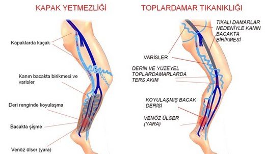Genel görünüm, ağrı, bacaklarda ağırlık hissi, bacakların kolayca yorulması, yüzeyel tromboflebit, kanama, ayak bileğinde hiperpigmentasyon, lipodermatoskleroz, atrophie blanche, venöz ülser.